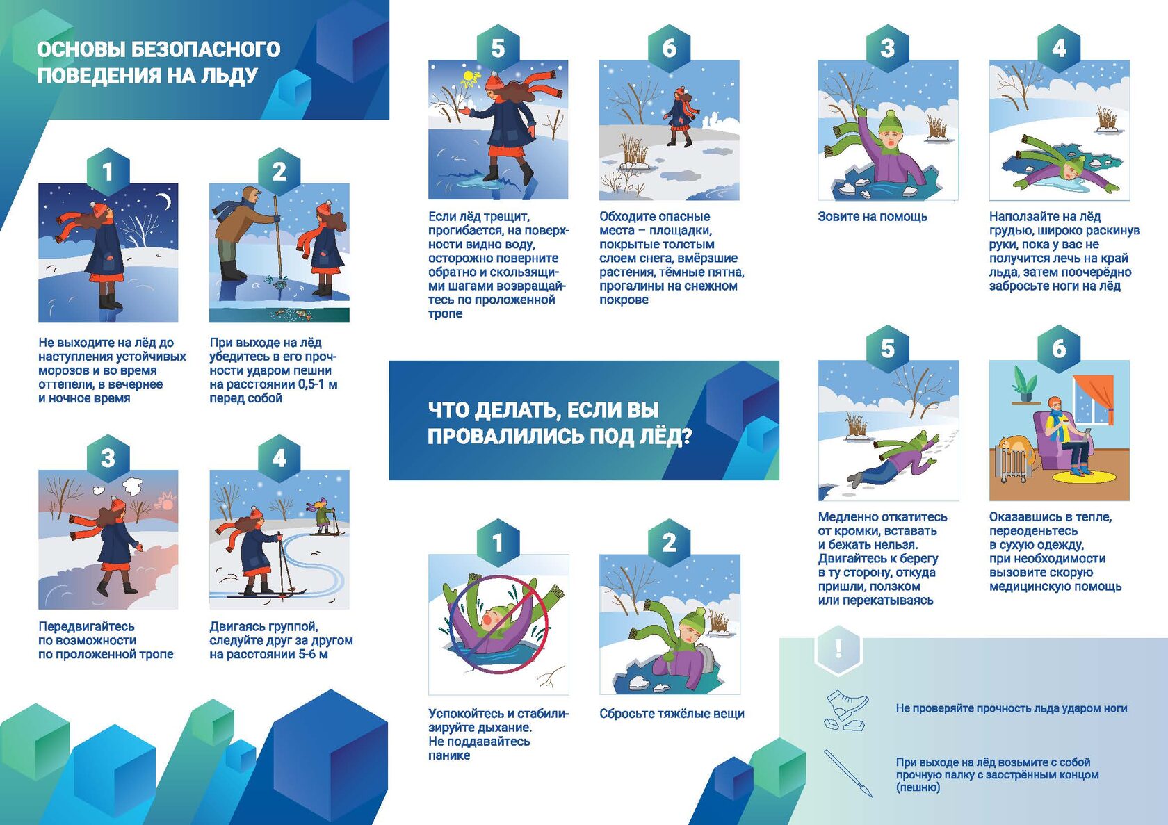 Департамент по делам гражданской обороны, чрезвычайным ситуациям и пожарной безопасности города Москвы делится памятками о поведении на льду, действиями в случае, если вы провалились под лёд, правилами пожарной безопасности и регламентом использования пиротехники.